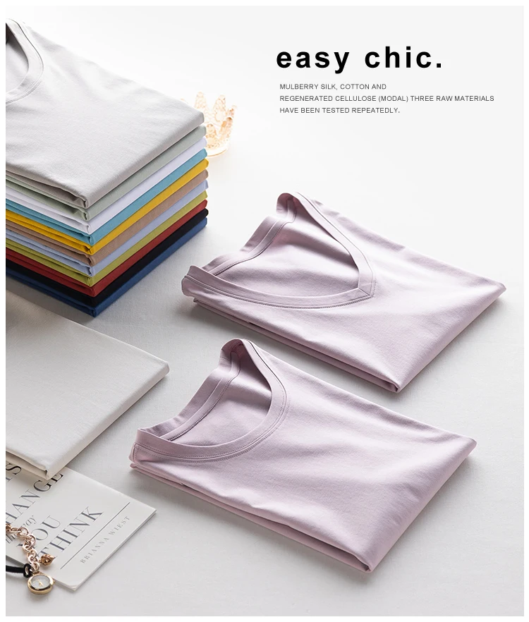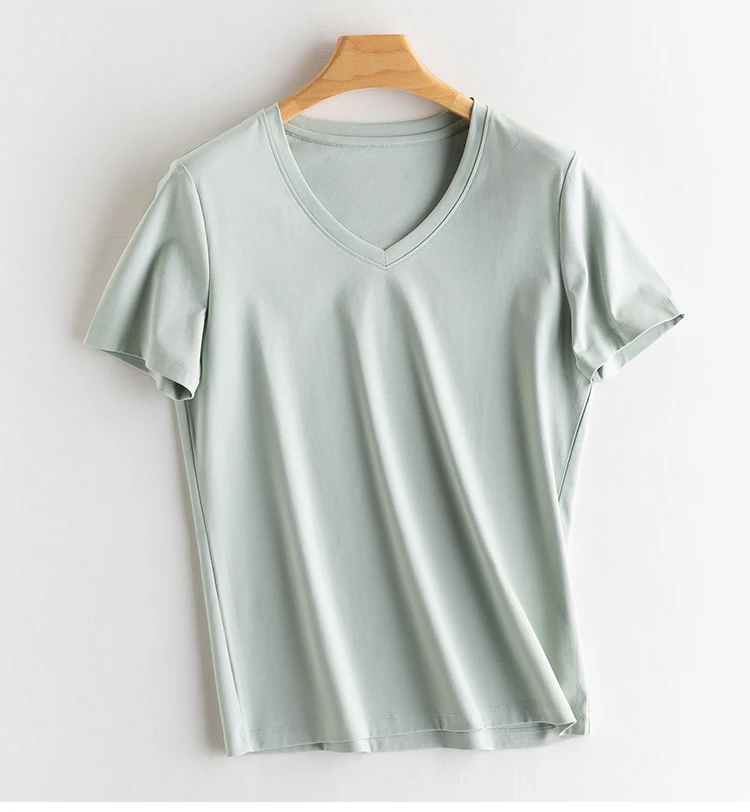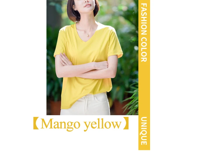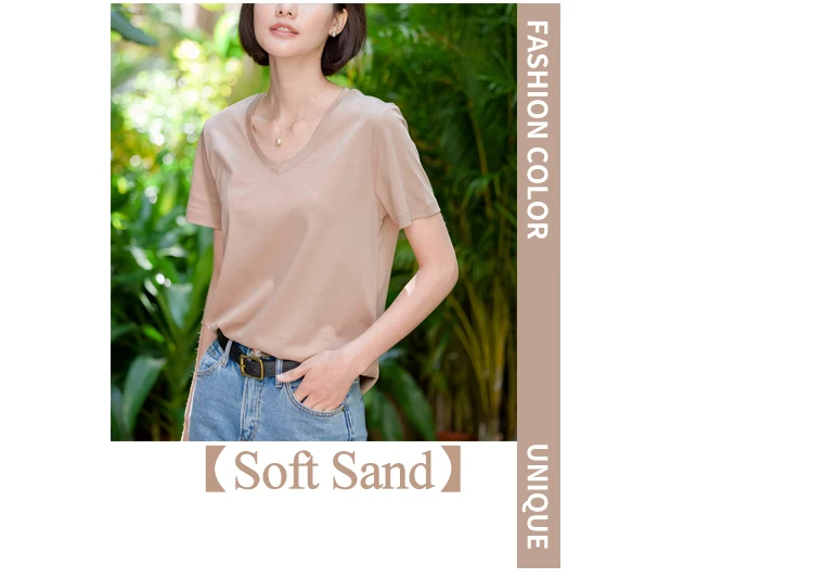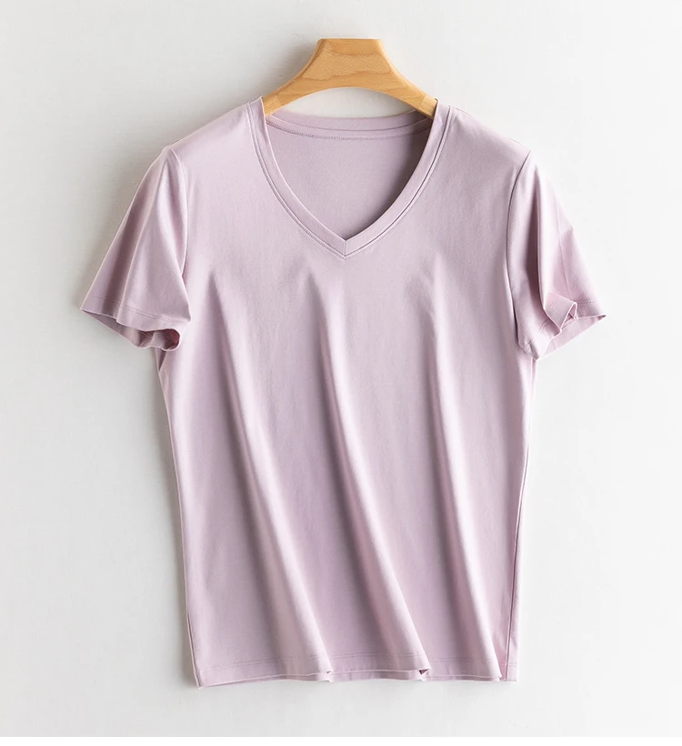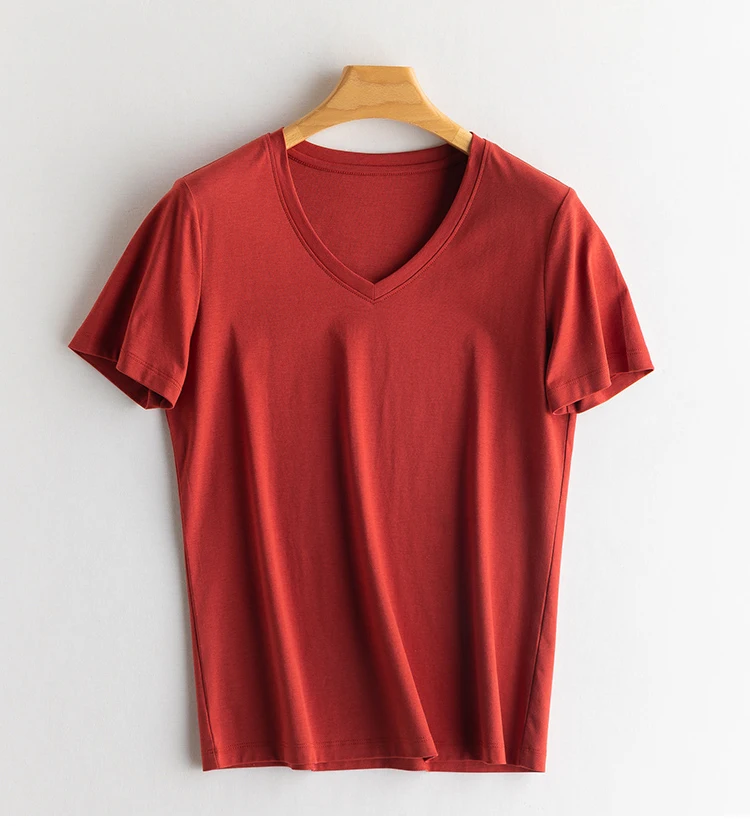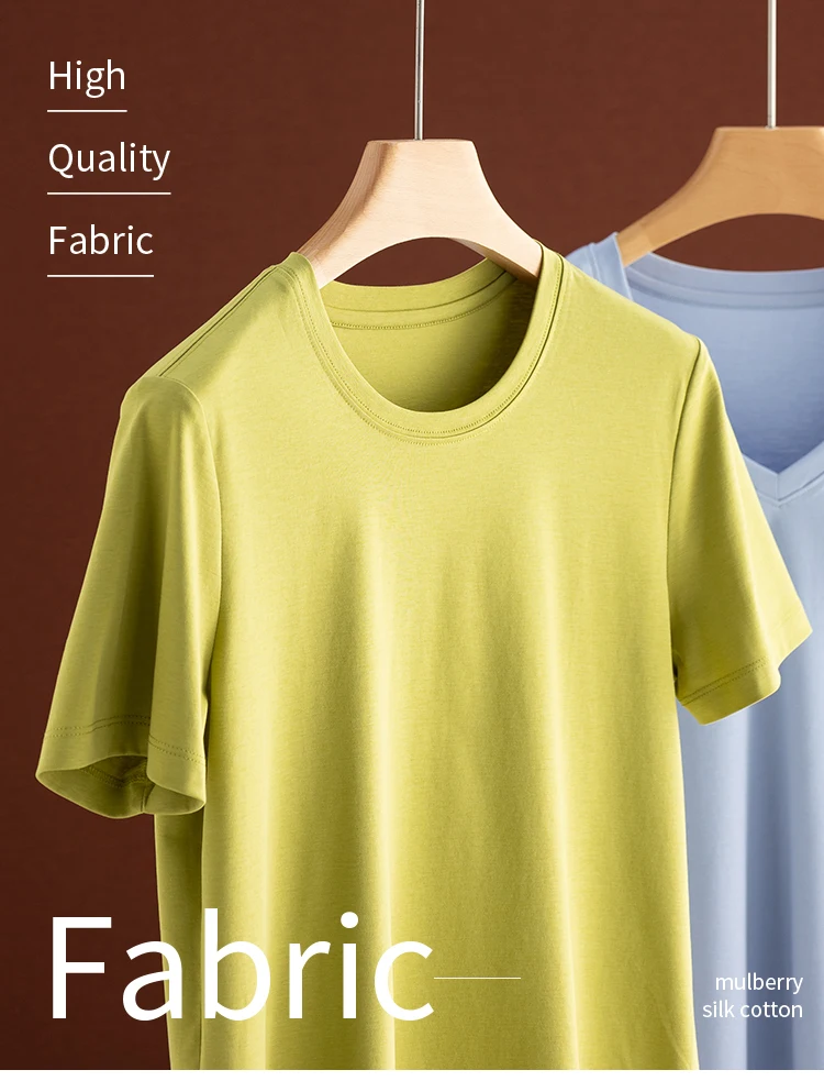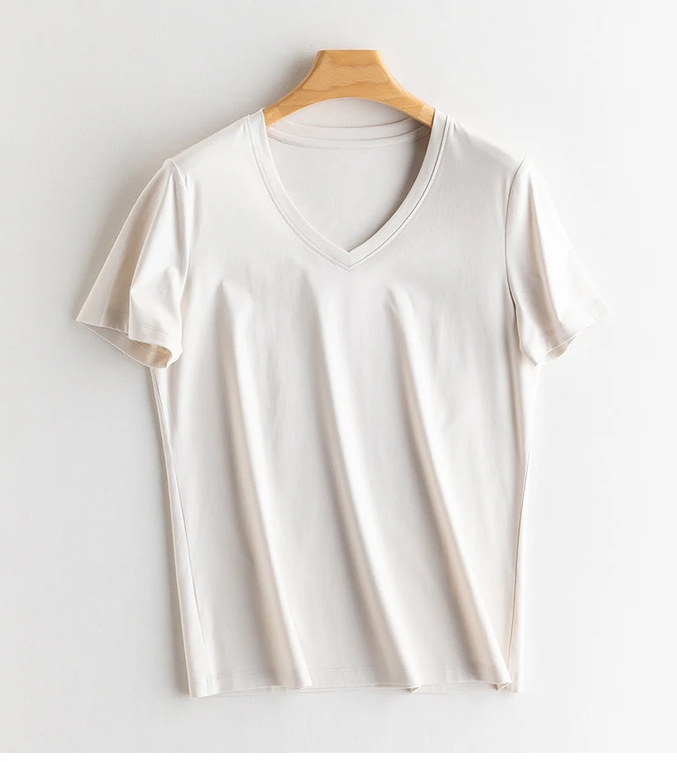 6% Real Silk Cotton Modal Women's T-shirt 2026 Summer Tees Short Sleeve Solid Tee Shirts V-neck Casual Woman Basic T shirt Tops