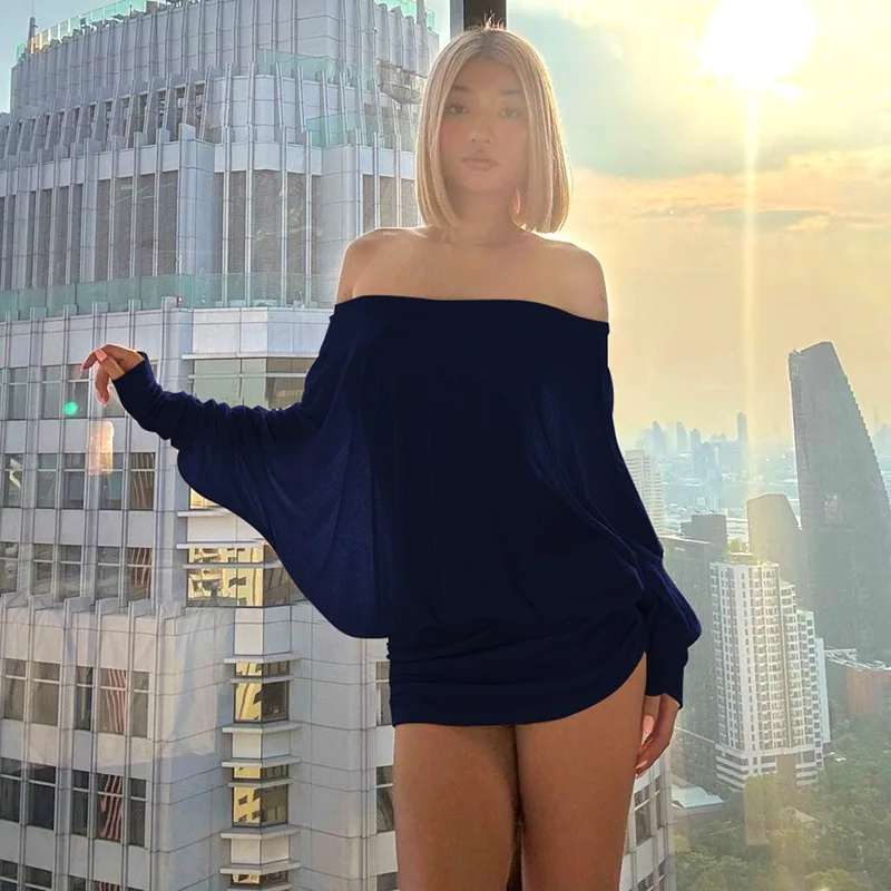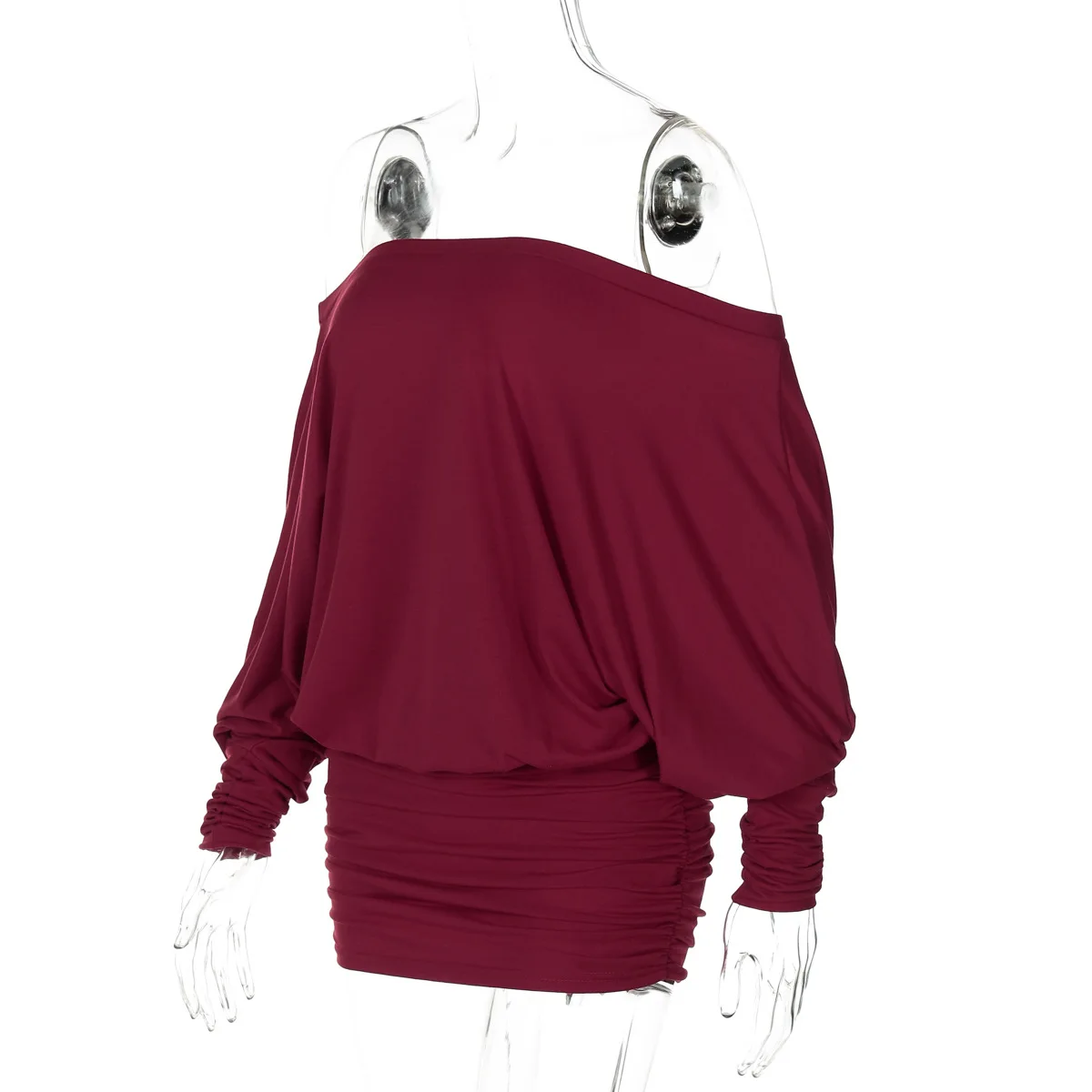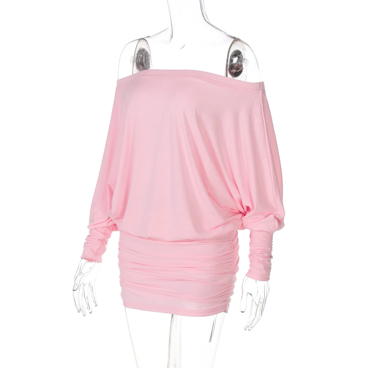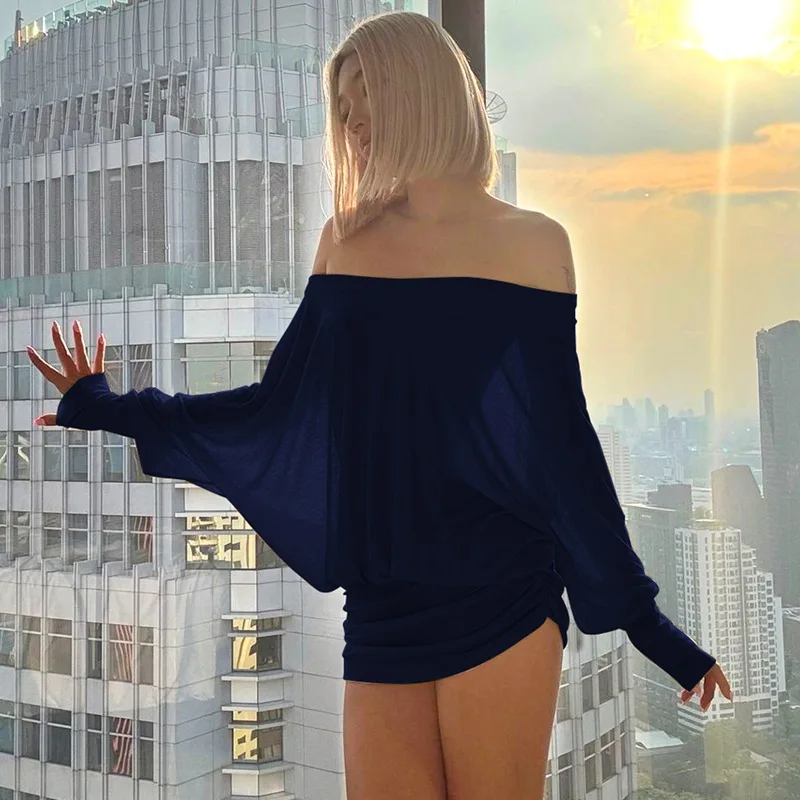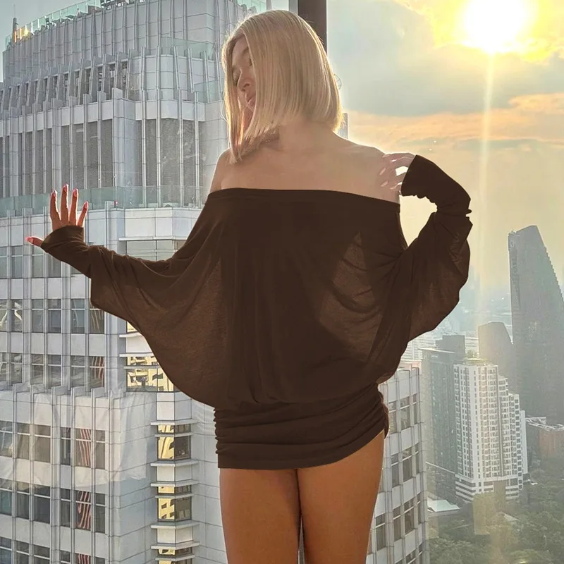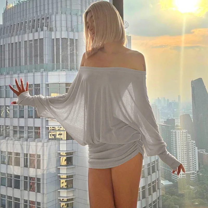 Cryptographic Fashion Off Shoulder Sheer Mini Dress Outfits for Women Hot Sexy Long Sleeve Ruched Party Dresses Bodycon Solid