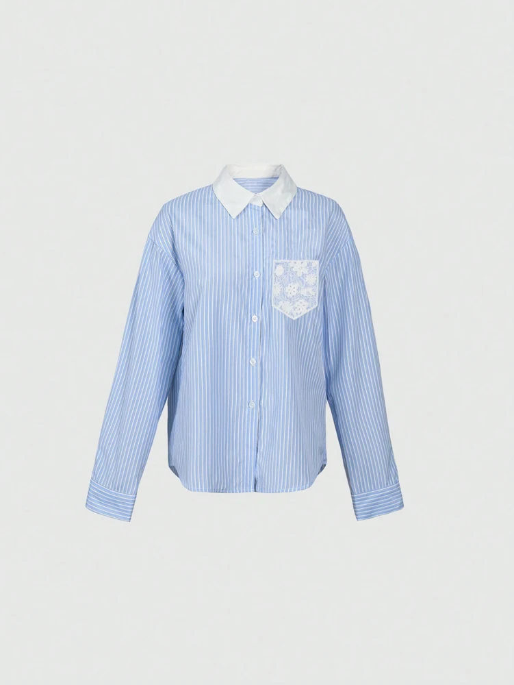 Women's Striped Clash Collar Lace Pocket Shirt, Daily Casual Shirt, Regular Fashion, Back to School Season